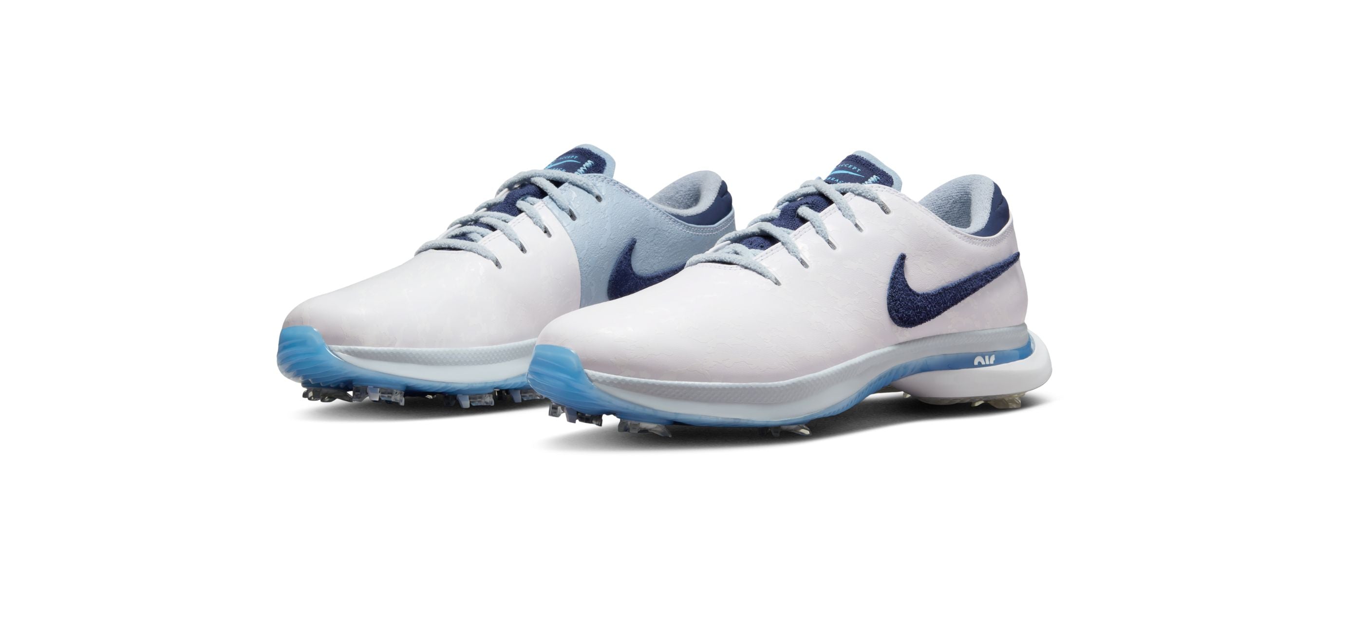 Now Nike has revealed the NRG theme that will touch down on the Pegasus 89 for the U.S. Open at Pinehurst: “Accept and Embrace”. Taking cues from the event’s host state North Carolina, the sneaker is treated to shades of dark and light blue, a theme made famous by Michael Jordan’s alma mater. But while some will come for the color scheme, others will stay for the materials. A variety of textures is utilized across the Swooshes, overlays, tongues and sockliners varying from hairy and smooth suede to soft terry cloth, while the words “Accept” and “Embrace” show up on the tongue labels, shoelace ends and insoles. The heel portions of the sneakers reveal the number 2, representing the famed Pinehurst No. 2 golf course where the tournament will be played. Lastly, the marbled outsole is a pleasing combination of many of the hues used throughout the upper section.